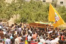On 22 June, Israeli units shot dead two Palestinians and wounded another 11 in overnight clashes in Ramallah and Nablus, while nine (Israeli statistic) to 38 (Palestinian statistic)[170] were arrested and five charity offices were raided. Israeli forces also raided Abu Dis and Al-Quds University's law faculty, seizing flags and several computers.[171] Ahmad Said Suod Khalid (27), an epileptic,[172] of Ein Beit al-Ma' refugee camp was shot in the abdomen, back, and thigh,[173] for refusing an order to turn back as he insisted on going to a mosque for dawn prayers. Muhammad Ismail Atallah Tarifi (30) was found dead on the roof of a building opposite an Israeli sniper position,[174][175] an autopsy found he was shot dead by an M16, a rifle in use with the IDF.[176][177] Mourners at his funeral in al-Bireh later complained that settlers from Psagot had fired at them, injuring one.[178] Palestinians, protesting at the cooperation given Israeli forces by their own police, who dispersed crowds by firing live ammunition in the air, smashed four local police cars in Ramallah, and, once Israelis had withdrawn from the city, raided a police station in Al Manara Square.[173] Abbas, affirming that he was not convinced Hamas was responsible, called on Netanyahu to condemn two earlier killings, and asked if the criminal kidnapping justified 'the killing of Palestinian youth in cold blood?'[179] The Palestinian Prisoners' Society named 420 people so far arrested, claimed Israel consistently understated the numbers and refused to disclose where they are detained.[170]