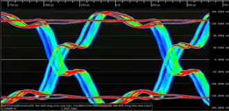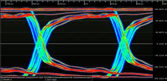 In telecommunication, an eye pattern, also known as an eye diagram, is an oscilloscope display in which a digital signal from a receiver is repetitively sampled and applied to the vertical input (y-axis), while the data rate is used to trigger the horizontal sweep (x-axis). It is so called because, for several types of coding, the pattern looks like a series of eyes between a pair of rails. It is a tool for the evaluation of the combined effects of channel noise, dispersion and intersymbol interference on the performance of a baseband pulse-transmission system. The technique was first used with the WWII SIGSALY secure speech transmission system.