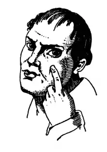 The eyelid pull is a gesture in which the finger is used to pull one lower eyelid further down, exposing more of the eyeball. This gesture has different meanings in different cultures, but in many cultures, particularly in the Mediterranean, signifies alertness, or a warning to be watchful.[1][2][3] In the Italian language, one can say occhio (eye), not necessarily with the gesture, to signify the same.[4]