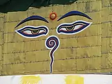 The Eyes of Buddha (also called Buddha eyes or Wisdom eyes[1]) is a symbol used in Buddhist art. The symbol depicts two half-closed eyes, a style sometimes referred to as the Adamantine View (Sanskrit: Vajradrsti).[2] In between and slightly above the eyes is a circle or spiral which represents the urna,[3] one of the thirty-two characteristics of a great man (Sanskrit: Mahāpuruṣalakṣaṇa) in Buddhism.[2] Directly below the urna is a curly symbol stylized as १, which represents the number one in Devanagari numerals.[4][5] The curly symbol, which represents either a nose or a divine fire emanating from the urna above, symbolizes unity.[1]