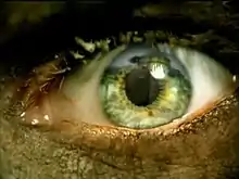 The video was shot as a "first-person narrative about the horrors leading up to the final moments of a soldier at war", and was described as "a single, long and tight close-up of the soldier's eye with images clearly reflected within his pupil and iris and perfectly choreographed with the rhythm of the music. Reflected are disconcerting images of para trooping into enemy territory, gunfire, helicopters and tanks, explosions, poignant flashbacks of his wife and child and home, and the images of his death."[12] Two endings were shot; one in which the soldier is killed as the result of sustained combat wounds, and another in which the soldier commits suicide by hanging - the latter one was used.[12] Jeff Hanneman confirmed that the band "loved" the eye concept, and personally felt that the video was "pretty amazing" when he first viewed it.[9] King admitted the film is "pretty cool — I thought it was neat idea — very different, especially for us, because we usually do performance based videos."[10] The video was exclusively posted on mp3.com late in October 2006.[12] In 2007, the video earned a Metal Hammer Golden Gods Awards nomination for Best Video, but eventually lost to Avenged Sevenfold's "Seize The Day."[13]