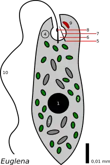 The eyespot apparatus (or stigma) is a photoreceptive organelle found in the flagellate or (motile) cells of green algae and other unicellular photosynthetic organisms such as euglenids. It allows the cells to sense light direction and intensity and respond to it, prompting the organism to either swim towards the light (positive phototaxis), or away from it (negative phototaxis). A related response ("photoshock" or photophobic response) occurs when cells are briefly exposed to high light intensity, causing the cell to stop, briefly swim backwards, then change swimming direction. Eyespot-mediated light perception helps the cells in finding an environment with optimal light conditions for photosynthesis. Eyespots are the simplest and most common "eyes" found in nature, composed of photoreceptors and areas of bright orange-red red pigment granules.[1] Signals relayed from the eyespot photoreceptors result in alteration of the beating pattern of the flagella, generating a phototactic response.[2]