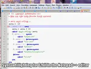 - Ezhil language has syntax highlighting support for Notepad++ and Emacs
