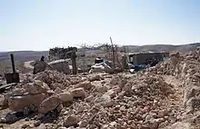 Nawi, one of several Israeli activists in the South Hebron hills[lower-alpha 10] but according to David Shulman, the "real hero" of the area,[32] is said to have adopted the distinctive cave-dwelling Bedouin resident in this zone,[33] Eighty to a hundred members of these families, of the Bedouin al-Hathalin clan,[34] refugees from Tel Arad in the aftermath of the 1948 Arab–Israeli War, dwell at Umm al-Khair, a village south of Hebron, 30 metres from the Israeli settlement of Carmel, Har Hebron.[35] This is one of the many khirbehs of that area.[36] They eke out a rough livelihood pasturing their goats and sheep on rocky land purchased from its Palestinian owners in the early 1950s.[37] They are hardscrabble farmers of desolate hills where, according to Nawi, "nobody else would even try to grow anything," but where these Bedouin are often prevented from working the land.[3][lower-alpha 11][lower-alpha 12] His attachment to these people and their biblical way of life flowed, he said, from his first encounter with them. He thought their distinctive lifestyle was subject to an "existential danger" in the way their fields were burned, their grazing stock poisoned,[lower-alpha 13][lower-alpha 14] their wells poisoned, or demolished,[38] their aged beaten and their land expropriated.[25][lower-alpha 15] He has been assaulted by settlers while helping Palestinians harvest olives from their own olive groves.[39] Some, fearing for their lives, would not return to their fields unless Nawi accompanied them.[40] He slept overnight in their houses to deter IDF soldiers reportedly throwing rocks at dwellings after dark.[41] He was active in many of their encampments from Bi'r al-'Id to Susia and Umm al-Kheir.[42] His arrival on the scene when settlers attacked a Bedouin family near Twamin and stole 450 head of their sheep livestock, was sufficient, according to Rabbis for Human Rights, to cause the settlers to desist and retreat.[43]