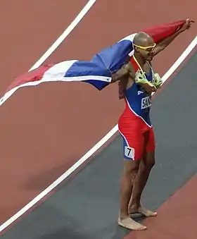 Félix Sánchez, (born August 30, 1977) is a retired Dominican-American track and field athlete. He is of Dominican descent, was born and raised in the United States, and competed for the Dominican Republic, specializing in the 400 meter hurdles. He is a two-time Olympic gold medallist, winning gold in 2004 and 2012, and was also World Champion in 2001 and 2003. Just before turning 36, he set the Masters M35 World Record with a time of 48.10. Sanchez acquired many nicknames: "Super Felix", "the Invincible", "Superman", and "the Dictator".[1]