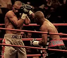 Trinidad came out of his second retirement for a fight against former four-division champion Roy Jones Jr. on January 19, 2008. According to the contract, it was contested at a catchweight of 170 lb (77 kg), and was broadcast live on HBO pay-per-view.[35] The card took place at Madison Square Garden in New York City. Trinidad began the fight on the offensive and won the first two rounds. The third and fourth rounds were won by Jones who relied on the velocity of his punches.[36] This pattern continued in the fifth and sixth rounds.[36] In the seventh round, Jones scored a knockdown following a right hand. Following this Jones continued to use his speed while Trinidad pursued the offensive, in the tenth round Jones scored a second knockdown after landing a combination.[36] The judges declared the fight a unanimous decision in favor of Jones with scores of 117–109 and 116–110 twice.[36]