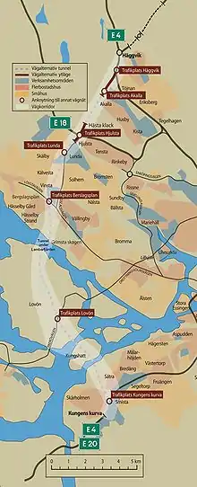 The highway has been in the planning stage since 1966, when a regional planning sketch titled Greater Stockholm Physical Structure 2000 (Swedish: Storstockholm fysisk struktur år 2000) proposed three concentric circular arcs surround Stockholm to the west.[1] The innermost arc was Brommagrenen, whose on-ramps were put in place already when Essingeleden was under construction. The next bypass to the west was a connection between Essingeleden at Brännkyrka over Ålsten past Bromma airport and northwards, an extent that is reminiscent of Diagonal Ulvsunda. The third, outermost bypass had an extent mostly coinciding with the currently planned Förbifart Stockholm and was called Kungshattsleden. In the 1992 Dennis Package(sv) it had the name Västerleden (Western Route). In 2001, an alternative consisting of a tunnel under Ekerö was included in the plans.[2]
