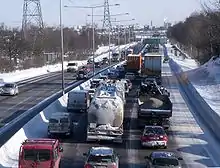 The road capacity over the relatively narrow passage between Saltsjön in the east and lake Mälaren in the west (where Stockholm is located) has not been expanded since Essingeleden opened in 1967. Essingeleden was designed with a capacity of 80,000 vehicles per day; today, the load is twice that on a normal weekday.[3] This makes Essingeleden sensitive to traffic disturbances, with consequent road congestion. The heavy vehicular load also causes severe wear and tear on the road surface, with large needs for repairs as a result.[3]