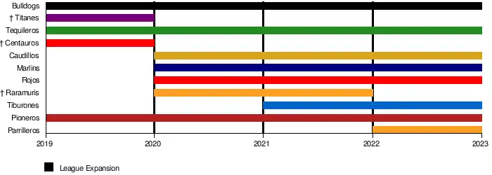 The league held its inaugural season in 2019 with five teams: Bulldogs de Naucalpan, Centauros de Ciudad Juárez, Pioneros de Querétaro, Tequileros de Jalisco and the Titanes de la Ciudad de México. The Pioneros finished as the first league champions after beating the Centauros 16–0 in the final.[3]