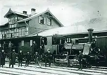 On 14 March 1888, Prince Regent Luitpold granted the concession for the construction of the Oberdorf–Füssen line to the Lokalbahn AG (LAG) company. The railway and Füssen station were put into operation on 1 December 1888. The station was connected by a wide road to the centre of Füssen. A two-story house was built next to the station for railway employees. The station building was built to the south of the railway tracks in a style then typical of the LAG and has similarities to the station buildings in Bad Heilbrunn and Oberau. The ground floor was built of freestone, the first floor was constructed with trusses, with the compartments filled with exposed brick. The attic was built with a wooden structure.[4]