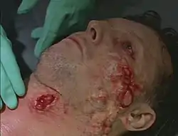 ![]() A prisoner with exploding pustules. The pustules were carefully rigged to burst on command by makeup supervisor Toby Lindala. | |