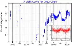 A visual band light curve of V832 Cygni. The main plot shows the long-term variability, and the inset plot shows the variation over a single orbital period. Adapted from Harmanec et al. (2002)[1]