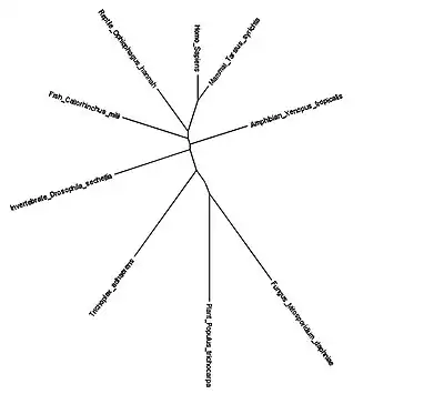 The size of the gene family is two, and includes FAM210A and FAM210B. Gene duplication seems to have occurred when plants diverged from protists. The most distant ortholog found was Populus trichocarpa, also known as the black cottonwood tree.[12] The unrooted phylogenetic tree below demonstrates this divergence.[13] All of the organisms in the tree can also be found in the ortholog table above.