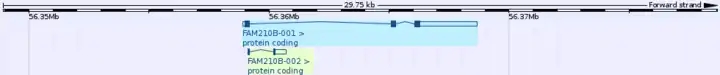 FAM210B has 2 known splice variants, formally known as FAM210B-001 an FAM210B-002. FAM210B-001 is 3 exons in length, whereas FAM210B-002 is 2 exons.[6]