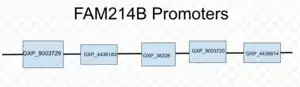 Using the Genomatix Gene2Promoter tool, it was determined that the FAM214B has 5 promoters that are found in Homo sapiens.[20] The promoter GXP_38326 has the highest number of encoded transcripts which spans on position 35115811 to 35116911 on the negative strand of human chromosome 9.