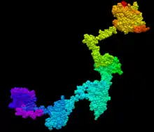 Tertiary Structure was predicted using I-Tasser where the purple represents the C-terminal and the red represents the N-terminal shown on the right.[17]