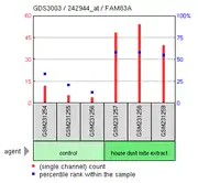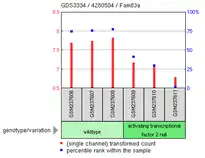 FAM83A is expressed in many different areas of the human body, and at very different levels.[22] EST data suggests that this gene is expressed primarily in adults. It shows significant levels in the mouth and larynx, with other raised expression in the prostate, lung, and esophagus.[22] These normal levels are even more elevated in head and neck tumors, lung tumors, prostate cancers, and bladder carcinomas.[22] Microarray expression data also show different environmental conditions, especially irritants. Such irritants can be cigarette smoke, where FAM83A has been shown to increase expression after 24 hours exposure,[23] and house dust mite extract on bronchial epithelial cells, where FAM83A expression also increases after exposure.[24] FAM83A shows decreased expression when activating transcription factor 2 (ATF2) is knocked out.[25] Since ATF2 was not predicted to bind in the promoter region, it suggests that there is an indirect relationship between FAM83A and ATF2. With increased expression to irritants and allergens along with an indirect relationship with ATF2, it suggests FAM83A may be in a signaling pathway.