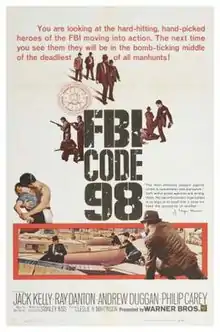 FBI Code 98 is a 1962 crime drama directed by Leslie H. Martinson and produced by Warner Bros. Originally intended as television pilot, the film was instead released theatrically in the United Kingdom in 1962,[1] and in the United States in 1963. FBI Code 98 stars many Warner Bros. contract players such as Jack Kelly, Ray Danton, Andrew Duggan and William Reynolds who later costarred on the Warner Bros Television show The F.B.I.. The film was narrated by William Woodson, who had previously narrated the radio show The FBI in Peace and War.