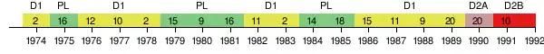 In the 1970s and 1980s SKA moved between Top and First leagues several times. After relegation 1973, they played in the First League in 1974, 1976–1978, 1982–1983, and 1986–1989, and in the Top League in 1975, 1979–1981, and 1984–1985. SKA spent two last years of the Soviet football (1990 and 1991) in the Second League.