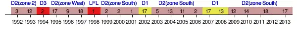 After entering the Russian Second Division, SKA have been playing there with a few exceptions: they played in the Third Division in 1994, in the Amateur Football League in 1998, and in the First Division in 2002. In 2002 SKA finished 17th in the First Division, going straight back down but recording the best result in Russian football. It finished 2nd South Zone of Second Division but returned First Division after relegations of Dynamo Makhachkala, FC Volgar-Gazprom Astrakhan and Lada Togliatti due to their licences were refused. It finished 17th in 2007 and 13th in 2008. Despite finishing outside of relegation zone in 2008, the club could not afford to play in the First Division for 2009 and volunteered to get relegated to the Second Division for 2009. After playing on that level from 2009 to 2013–14 seasons, the club failed professional licensing and began the 2014–15 season in the Russian Amateur Football League. It returned to the third-tier Russian Professional Football League for the 2015–16 season.