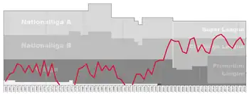 From the 2001–02 season, Vaduz played in the Swiss Challenge League (formerly called Nationalliga B), the second tier of the Swiss league system. Since then, Vaduz has been one of the best teams in the Challenge League and gave serious challenges towards promotion to the Super League, especially in 2004 and 2005, playing two-leg play-offs in both cases. In the 2007–08 season, Vaduz secured promotion to the Swiss Super League on 12 May 2008 by winning the Challenge League on the season's final day, giving Liechtenstein a representative at the highest level of Swiss football for the first time. Vaduz, however, was relegated back to the Challenge League after one season in the top flight. Vaduz finally returned to the top level after five years in the Challenge League.