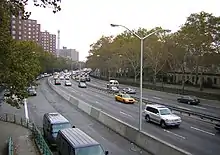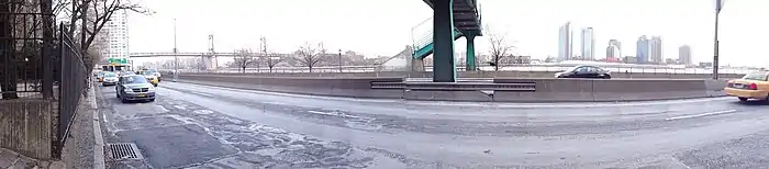 The section from 125th Street and the Triborough Bridge ramp south to 92nd Street was completed in 1936.[12] The sections from 92nd Street down to Battery Park (with the exception of a section from 42nd to 49th Streets, located underneath the headquarters of the United Nations) were built as a boulevard running at street level.[13] The first "downtown" section of the boulevard, between Grand and 12th Streets, was completed in June 1937.[14] Two more downtown sections, from 12th to 14th Streets and then from 14th to 18th Streets, were opened in 1939.[15] A short connector from Grand to Montgomery Street was completed in May 1940, which meant that the boulevard was now continuous from Montgomery to 30th Streets.[16] The next month, a large stretch from 49th to 92nd Streets opened. By this point, the only contiguous section that remained to be completed was the stretch between 30th and 49th Streets.[17]