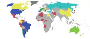 Map of best finishes per team. Defunct countries are denoted by circles.