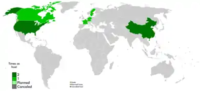 Only China and the United States have hosted the event on more than one occasion. The 2003 edition was originally awarded to China, but was moved to the United States in May 2003 due to the SARS outbreak. China were instead awarded the right to host the following edition in 2007.[3]