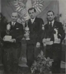 Bronisław Witkowski (left), Martin Tietze (center) and Maks Enker with their trophies at European Luge Championships 1935