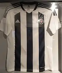 For most of its history, Partizan has played in black and white striped jerseys, but during its earliest days it used entirely dark red, blue or white jerseys.[100] In 1950, Partizan briefly had an all-white shirt with a blue diagonal stripe, besides an all blue shirt.[100] From 1952, the first red-blue striped and quartered jerseys appeared.[100] In 1957, the club was on tour in South America and after a friendly game with Juventus, a president of the Italian club, Umberto Agnelli, donated the club two sets of black and white jerseys.[99] Since then, Partizan has played mainly in black and white striped shirts,[100] with black or white shorts and socks.[101] But there were exceptions, like in 1974, when they wore a black and white hooped shirt, and 1982, when they have played in a plain white jerseys with a thick black stripe across them.[100] In 1990, the red and blue jersey returned after more than 30 years, in an away match against Hibernians during the UEFA Cup campaign. All this time, the away shirts have been mostly either all white or occasionally red-blue striped, but in recent years an all-black strip is usually used.[100]