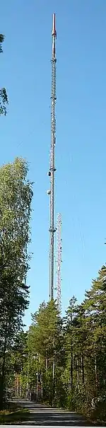 When the mast was first built in 1971, its height was 303 metres (994'). Its height was increased to 326 metres (1070') in 1988, when the station was expanded, and the present mast was erected. It shares the title of third highest structure in Finland, after the Tiirismaa (in Hollola), and Haapavesi radio and TV masts. The radio mast in Kiiminki has the same height.[1]