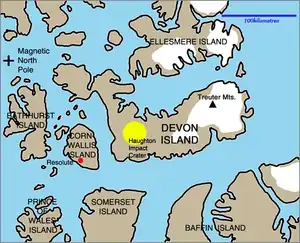 The station is located on Devon Island, a Mars analog environment and polar desert, approximately 165 kilometres (103 mi) north east of the hamlet of Resolute in Nunavut, Canada. The station is situated on Haynes Ridge, overlooking the Haughton impact crater, a 23 km (14 mi) diameter crater formed approximately 39 million years ago (late Eocene).[3] The location is approximately 1,609 km (1,000 mi; 869 nmi) from the Geographic North Pole and approximately 1,287 km (800 mi; 695 nmi) from the Magnetic North Pole.