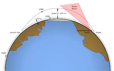 - The system provided a way of evading early warning radar systems. This advantage comes from two different attributes of the FOBS: (1) that it could attack from any direction, as stated above, and (2) that it could travel along a very low Earth orbital path. The first point has to do with the fact that one of the primary missile defense radar systems of the US around the time of the FOBS' early development was the Ballistic Missile Early Warning System (BMEWS). The BMEWS was oriented to detect ballistic missiles coming from the aforementioned 'North Pole route' (its three stations being located in Alaska, Greenland, and the United Kingdom) and therefore wouldn't detect a strike flying along a southern orbital path.[3][25][22][2] The second point considers that FOBS missiles could fly relatively close to the Earth's surface; they could have a perigee of under 100 miles (160 km) and an apogee as low as 125 miles (200 km) above the ground (see apsis).[25][4][23] US radar systems like the BMEWS were configured to detect ICBMs that flew several hundred to upwards of 1000 miles (1600 km) above the surface, not low altitude missiles like that of the FOBS.[25][26] Thus, the Soviet Union felt that striking with a FOBS would deprive the United States of valuable warning time that ICBMs were likely to give away, time that could be used to mount a devastating retaliatory attack.[24][26][23]