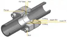 An insert made of carbon or stainless steel will be placed into the flared pipe end. The insert is soft sealed by an O-Ring to the pipe side. To be sealed against a flat counterpart (e.g. manifold or block) the insert has a groove on the front side for a so-called "F37-Seal" made of Polyurethane or optionally an o-ring or bonded seal made of carbon steel or stainless steel with a Nitrile rubber or FKM sealing lip. Alternatively, the front side of the insert can be flat. For a pipe to pipe connection, a special insert design with soft sealed cones on both sides to fit between two flared pipe ends is available.