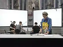 Current lines of research into the dynamics of forms has led Verdier to explore possible links between music and painting, specifically between pictorial and sonic lines. In July, 2017, at the invitation of the Festival d'Aix-en-Provence and its Académie, Verdier set up an experimental studio/laboratory in painting and music, with the goal of creating a new 360° immersive film experience for public viewing at the 2018 edition of the Festival.[10] As an artist in residence at the Juilliard School in New York City for several months in 2014, she worked with some of its foremost faculty members, including Darrett Adkins, Kenny Barron, William Christie, Philip Lasser and Edith Wiens, as well as with many students. A documentary by filmmaker Mark Kidel, The Juilliard Experiment, relating the extensive experiments carried out in Verdier's studio-laboratory at the famous American music and acting conservatory, was released in 2016.[11]