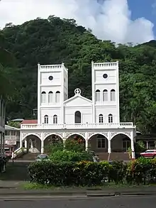 Fagatogo contains the Pago Pago port, the Pago Pago bus station and market, and the Co-Cathedral of St. Joseph the Worker of the Roman Catholic Diocese of Samoa-Pago Pago.[10] Fagatogo is also home to the governor's mansion, which sits on a hilltop just west of the Rainmaker Hotel site, in a section of Fagatogo called Utulei. This colonial mansion was built in 1903, during the naval administration. The 1917 Jean P. Haydon Museum is located a little further west. The old jail (built in 1911) and the police station sit just across the field from the Fono.[11] The architecture includes both 19th century clapboard buildings and newer, two-story, monotone concrete structures.[12]