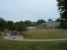 The park's official address is 2213 Dufferin Street. It is bordered on the west by Dufferin Street, on the north by Keywest Avenue, and on the south by Gibson Street. It consists of 9.1 acres (3.7 ha) of ground,[1] which contains the Fairbank Memorial Community Recreation Centre. It is home to Fairbank Outdoor Pool, a swimming pool that is run by the City of Toronto Parks, Forestry and Recreation West Toronto York District Aquatics Department. The facility consists of a baby pool, a large pool, and an eating area. The pool fits a capacity of 250 patrons which including a maximum of 50 in the baby pool area. The park also has a playground, an open athletic field for sports like rugby or soccer, and athletic courts for baseball, basketball, and bocce.[1]
