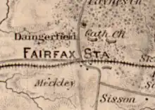 Although the exact date is unknown, the first station probably was constructed no later than 1852 as a stop on the Orange & Alexandria Railroad (O&A). The O&A was chartered in 1848 to run from the port city of Alexandria, Virginia, through Virginia's central farmlands to Gordonsville in Orange County.[3] The O&A was under construction in Fairfax County in 1850.[4] By October 1851, 28 miles of the railroad had been completed, taking it all the way through Fairfax County.[5] The O&A reported freight revenue originating at Fairfax Station in 1851.[6] The awarding of mail contracts in 1852 provides the strongest evidence of a station building having been constructed by that time. The U.S. Post Office Department established post offices at Fairfax Station and nearby Burke, another O&A stop, in April 1852.[7]