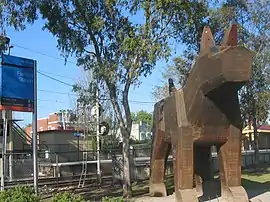 Erected in April 2000 and created by Ian Sinclair, Jackie Staude, David Davies and Alistair Knox, the work is constructed from recycled hardwood, standing 5.5 metres tall and approximately 8 metres long.[7][8][9] The theme was chosen in order to "represent the precinct's dog-loving community", and it was originally designed to interact with viewers – sensors allowed it to respond the presence of onlookers by wagging its tail, wiggling its ears and lighting up at night.[8][9][10]