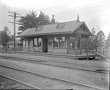 After the leasing of the New Jersey and New York Railroad to the Erie Railroad, the history of Fairmount Avenue station remained rather quiet, with minor changes to the station building and site occurring over the next seventy years. By 1966,[1] the station building had been sold off by the Erie Railroad for private usage as Barbara's General Store and Gifts. The former team track had already been removed from the station, and only the main southbound track and partial yard remained on site with the platform. The station building was already repainted orange along the wood siding and the windows, formerly a dark green, became white. The station continued service through Hackensack as the northernmost of the three stations in Hackensack.[1] In 1976, Conrail took over service of the former line vacated by the Erie Lackawanna (a merge of the Erie and Delaware, Lackawanna and Western Railroads) and service of the station. By 1980, during partial ownership between Conrail and New Jersey Transit, the Fairmount Avenue station remained as a part of the line,[7] but by the 1982 timetables, was removed from service.[8] The station building, although it does not receive any active service, remains standing in its orange and white paintjob.[9] The station building is now a donut shop.[10]