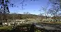 Fairview Cemetery is located on the west side of Hyde Park, bounded on the east by houses lining Turtle Pond Parkway, and the south by Boston's Mill Pond Reservation. The main entrance is near its southeast corner, accessed via Fairview Avenue from the junction of Turtle Pond Parkway and River Street. The core of the cemetery is dominated by a hill which provides views of the surrounding countryside, and is a significant influence on the circulation pattern. Early burials tended to be placed on the higher levels of the hill, and included large family lots with family monuments.[2]