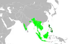 The Asian fairy-bluebird has a discontinuous distribution from India to Java and Vietnam. In India the species is present in the southwest of the country and in the northeast. From Burma it has a continuous distribution (in suitable habitat) throughout most of Southeast Asia, and down into Borneo and Sumatra, as well as on the Andaman Islands. The species is rare in Sri Lanka. The Philippine fairy-bluebird is found on Luzon, Polillo, Leyte, Samar, Mindanao, Dinagat and Basilan. The Palawan fairy-bluebird is endemic to the island of Palawan.[1]