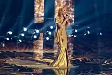 Eneda performed the song along with three backing vocalists on the main stage. A warm atmosphere was created by a "gold-ground" backdrop and theatrical smoke which gave the act a soft focus effect.[23] Eneda wore a long golden dress with a chapel train that "united" with the golden centre of the stage floor when filmed from above.[23]