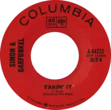 "Fakin' It" was issued as a single that summer and found only modest success on AM radio; the duo were much more focused on the rising FM format, which played album cuts and treated their music with respect.[10] The running time of the song was actually 3 minutes and 14 seconds. Radio stations at the time resisted playing songs lasting longer than three minutes, so Paul Simon had the time "faked" to read 2:74 on the label. Simon preferred the album version of "Fakin' It" to its single release. He felt the stereo remix "greatly improved" the original mix, which he considered to be "sloppy."[9] On the other hand, Billboard particularly praised the production of the single version.[11]