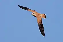 The nankeen kestrel is a small, slim falcon 28 to 35 cm (11 to 14 in) long with a wingspan of 66 to 78 cm (26 to 31 in).[8] The male weighs 121 to 195 g (4.3 to 6.9 oz) while the female weighs 115 to 273 g (4.1 to 9.6 oz).[8] It has pale rufous upper-parts with contrasting black flight-feathers and is finely streaked white below, with a black subterminal band.[9] The cere, eye-ring, and legs are yellow.[4] The male has a pale grey crown and tail with a darker grey tear-mark, while the female and juvenile have a pale rufous crown and finely barred rufous tail.[4] Plumage varies considerably in detail, and some birds can look very scruffy, but the slim build, small size and distinctive straight-winged hovering habit make identification easy. The only other Australasian raptors to hover are the elanid kites, which are much lighter in colour and a little larger, and the brown falcon, which is much larger and more heavily built, and hovers only occasionally. Altogether, the nankeen kestrel looks just like a pale, less patterned, and smaller derivate of the Eurasian kestrel, which it indeed is (see Gloger's Rule, Bergmann's Rule).