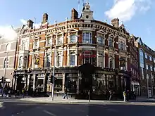 Reopened as The Falcon Hotel, the building is described by the Survey of London as a "robust piece of London pub architecture in the Franco-Italianate taste", in brick with cement dressings, and having an ornamental turret above the corner gable. The interior of the pub was remodelled in 1896 by the builders Turtle & Appleton, who created an open-plan space by the use of cast-iron columns to support the upper floor, and the introduction of elaborate oak-work and glass-panel illustrations of the ancient inn's life. A billiard room was added to the rear of the Hotel in 1901 by Tavener's widow. Tavener's venture appears to have been a great success, in large part thanks to its location; in 1911 the hotel was employing about 20 people. In 1921, Tavener's son, also John, sold the business for £70,000 to the Wenlock Brewery.[3]