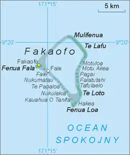 ![]() Map of Fakaofo Atoll, with the names of the islets in Tokelauan and the name of the Pacific Ocean in Polish | |