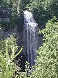 Just beyond its source, Cane Creek slowly gains strength as it absorbs Meadow Creek and several smaller streams. As the creek enters the gorge, it drops several hundred feet in less than a mile, including 45 feet (14 m) over Cane Creek Cascades and 85 feet (26 m) over Cane Creek Falls. A few hundred meters north of Cane Creek Falls, Rockhouse Creek spills 125 feet (38 m) over a plunge waterfall. Over the next half-mile, Cane Creek absorbs Fall Creek and Piney Creek, both of which enter from smaller gorges to the immediate west. During this stretch, part of the creek disappears underground into limestone sinks and reemerges at a spring known as "Crusher Hole."[2] Cane Creek continues to lose elevation before steadying near its confluence with Dry Fork. Beyond Dry Fork, the creek gradually descends to the Highland Rim, where it empties into the Caney Fork River.