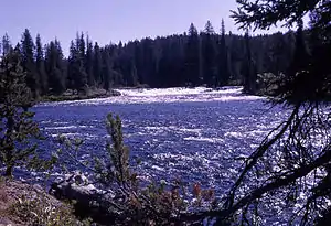 Fall River rises on the Madison and Pitchstone Plateaus in the southwest corner of Yellowstone National Park, Wyoming and flows approximately 64 miles (103 km)[3] to its confluence with the Henrys Fork of the Snake River near Ashton, Idaho. Historically, the river was referred to as the Middle Fork of the Snake River[4] or as Fall River or the Falls River by trappers and prospectors as early as the 1830s.[5] It was officially named the Falls River by 1872 Hayden Geological Survey, but was always called Fall River by the locals[6] and so the U.S. Board on Geographic Names changed the official name to Fall River in 1997 at the request of Idaho authorities.[1] The river is home to numerous waterfalls and cascades in its upper reaches.