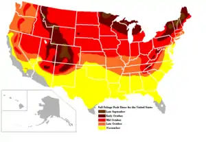 Autumn leaf color is a phenomenon that affects the normal green leaves of many deciduous trees and shrubs by which they take on, during a few weeks in the autumn season, various shades of yellow, orange, red, purple, and brown.[1] The phenomenon is commonly called autumn colours[2] or autumn foliage[3] in British English and fall colors,[4] fall foliage, or simply foliage[5] in American English.